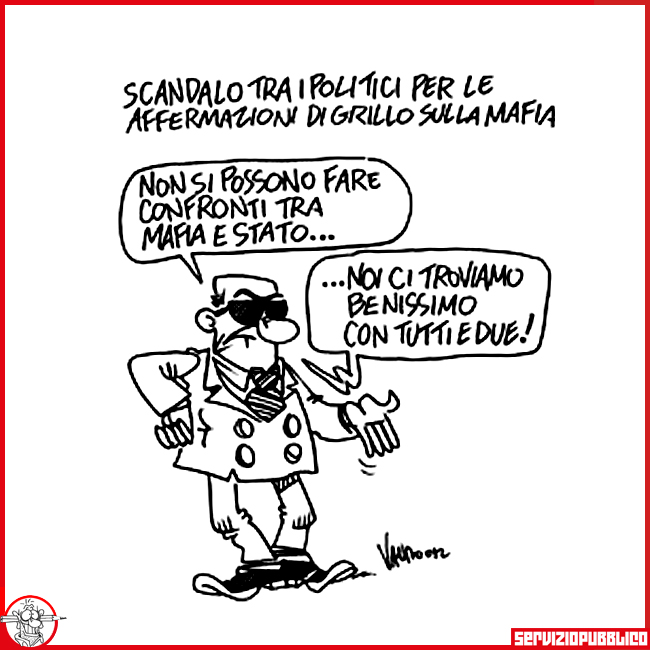 Le vignette di Vauro, Servizio PubblicoGrillo: “La mafia è meglio dello Stato” 03.05.2012 Servizio Pubblico. La carica dei tecnici LEGGI: “Per Beppe Grillo la politica strangola, Cosa nostra no. “Parole da mafioso” di Giuseppe Pipitone | 30 aprile 2012 Il Fatto Quotidiano condividi/share Fai clic per inviare un link a un amico via e-mail (Si apre in una nuova finestra) E-mail Fai clic per condividere su Facebook (Si apre in una nuova finestra) Facebook Fai clic per condividere su WhatsApp (Si apre in una nuova finestra) WhatsApp Fai clic per condividere su Telegram (Si apre in una nuova finestra) Telegram Fai clic per condividere su Mastodon (Si apre in una nuova finestra) Mastodon Fai clic per condividere su Bluesky (Si apre in una nuova finestra) Bluesky Correlati
