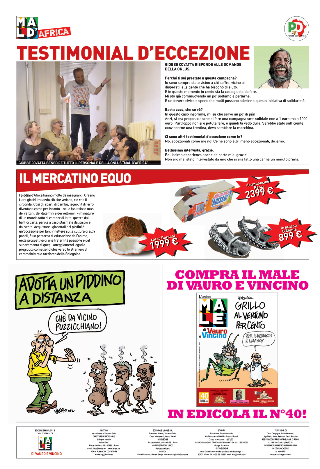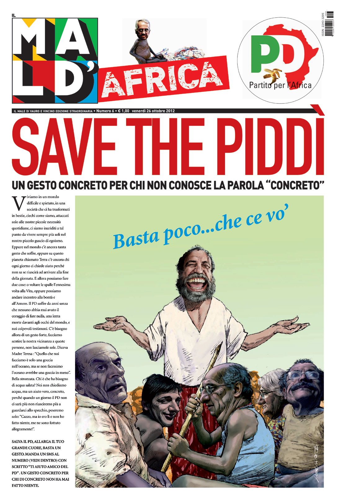 Eppure nel mondo c’è ancora tanta gente che soffre, eppure su questo pianeta chiamato Terra c’è ancora chi ogni giorno ci chiede aiuto perché non sa se riuscirà ad arrivare alla fine della giornata. E allora possiamo fare due cose: o voltare le spalle l’ennesima volta alla Vita, oppure possiamo andare incontro alla bontà e all’Amore. Il PD soffre da anni senza che nessuno abbia mai avuto il coraggio di fare nulla, una lenta morte davanti agli occhi del mondo, e noi colpevoli testimoni. C’è bisogno allora di un gesto forte, facciamo sentire la nostra vicinanza a queste persone, non lasciamole sole. Diceva Madre Teresa : “Quello che noi facciamo è solo una goccia nell’oceano, ma se non facessimo l’oceano avrebbe una goccia in meno”. Bella stronzata. Chi è che ha bisogno di acqua salata? Noi non chiediamo acqua, ma un aiuto vero, concreto, perché quando un giorno il PD non ci sarà più non riusciremo più a guardarci allo specchio, peseremo solo: “Cazzo, ma io ero lì e non ho fatto niente, me ne sono fottuto allegramente!”.