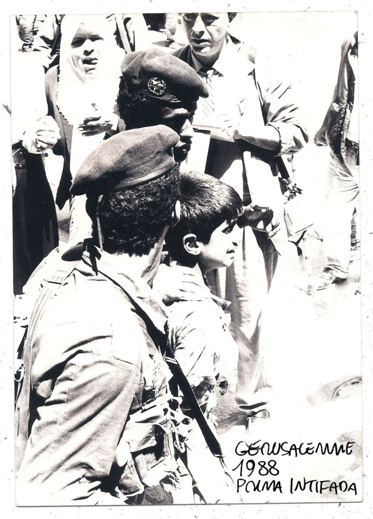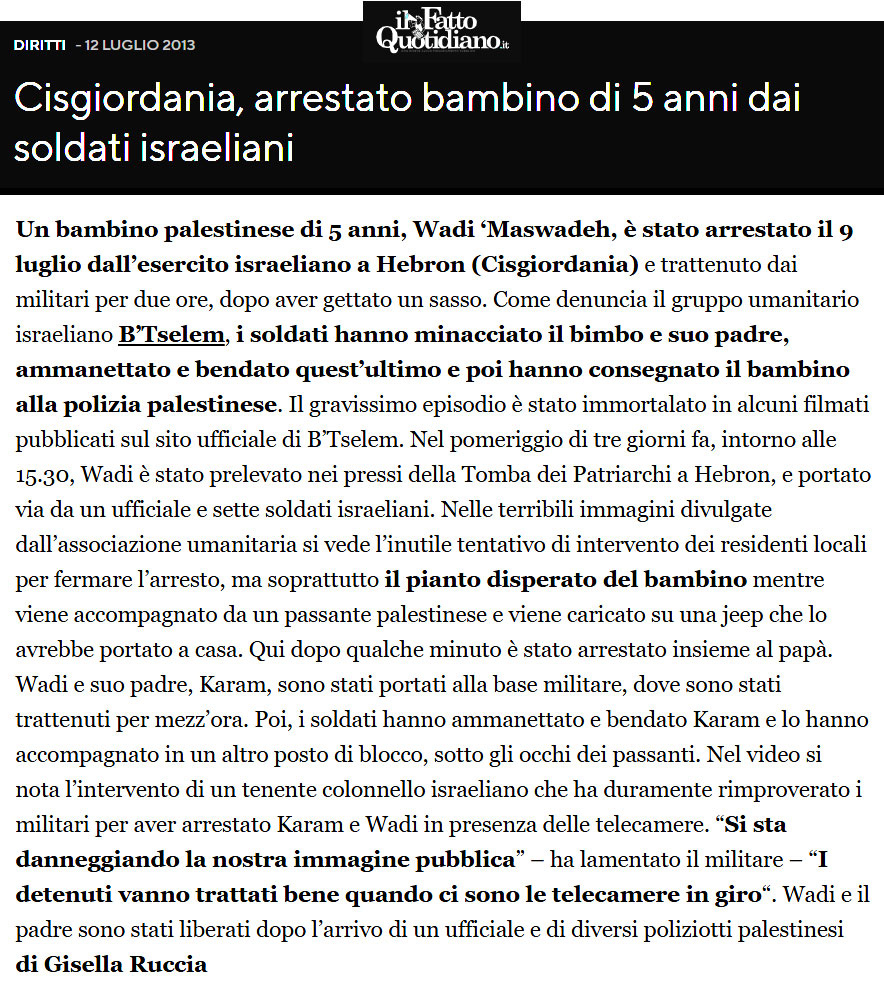 Militari israeliani arrestano un bambino poco più grande di Wadi. Quello sullo sfondo tra la gente che protesta sono io. Posto questa foto a testimonianza che la brutalità dell’esercito israeliano contro i bambini palestinesi non è purtroppo una novità. Nel 1988 non c’erano ancora mai stati attentati kamikaze. Qualcuno ha scritto che dare “una lezione” al piccolo Wadi servirà a non farlo diventare un terrorista. Non so cosa sia divenuto oggi oggi il bambino della foto. Non so nemmeno se sia ancora vivo. Ho solo una domanda. Per quanto ancora vogliamo restare indifferenti consentendo con il nostro silenzio a che queste sconcie barbarie si ripetano.