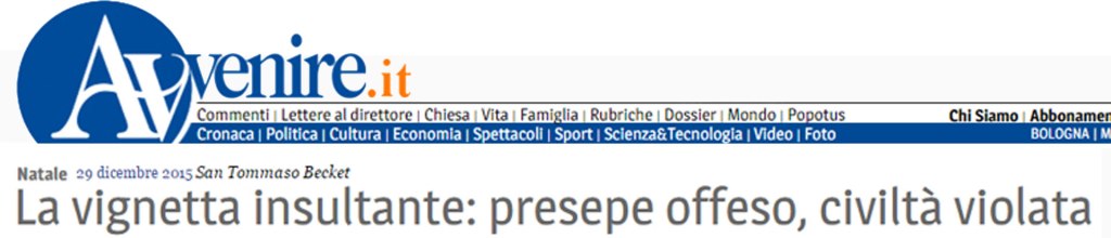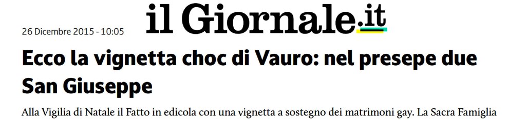 Il Giornale, 26 dic 2015: “Il Fatto Quotidiano vi augura un Natale sereno”. E il Santo Natale la redazione guidata da Marco Travaglio lo festeggia anche così: con una vignetta di dubbio gusto firmata dal solito Vauro Senesi. In prima pagina del Fatto Quotidiano in edicola la Vigilia c’è la capanna con due San Giuseppe. La Sacra Famiglia trasformata da Vauro in una famiglia omosessuale. E la didascalia: “Grecia – Legalizzate le unioni civili tra persone dello stesso sesso”.