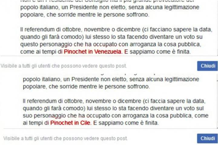 13.09.2016 – Voleva essere un duro attacco al presidente del Consiglio, paragonato ai “tempi di Pinochet in Venezuela”, ma l’errore non è passato inosservato. Il vicepresidente della Camera, Luigi Di Maio, in un post su Facebook dedicato alle vicende referendarie ha azzardato un paragone tra Renzi e il dittatore cileno, ma ha commesso una clamorosa gaffe: il regime militare del generale è finito in Venezuela. Il testo è stato subito corretto, ma la prima versione è rimasta nella cronologia delle modifiche: tanto basta agli utenti per rilanciare con ironia l’errore (Repubblica.it)