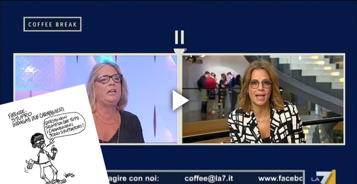 Coffee Break La7, 12.09.2017 – Scontro tra Elisabetta Gardini (Forza Italia) e Francesca Re David (Segretario generale Fiom): ‘Vauro si deve vergognare per la sua vignetta. Lei sta dicendo banalità vergognose contro l’Arma dei Carabinieri’.