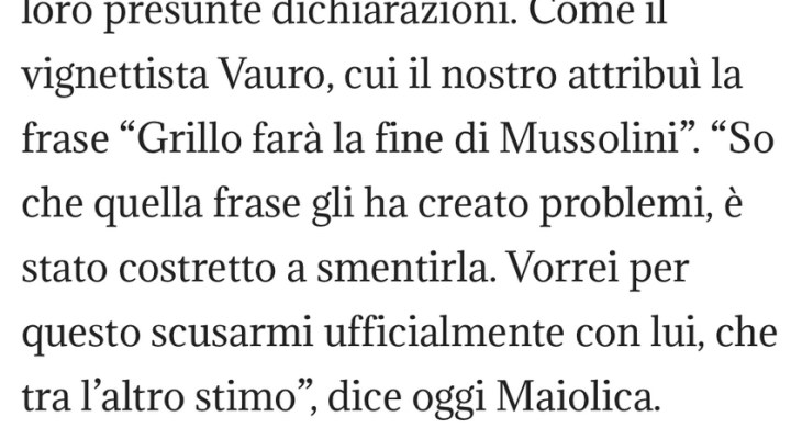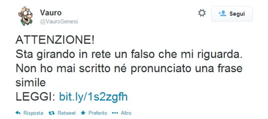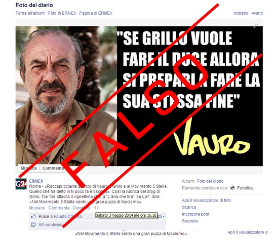 “Se Grillo vuole fare il Duce allora si prepari a fare la sua stessa fine”. E’ questa la frase che sui social network sta girando e che viene attribuita al vignettista satirico del Fatto Quotidiano Vauro Senesi. Una frase però che Vauro non ha mai pronunciato, come precisa lui stesso dalle pagine Facebook e Twitter.