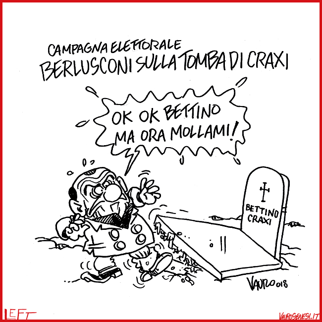 Le vignette di Vauro, LeftBerlusconi sulla tomba di Craxi 14/01/2018 LEFT online Berlusconi apre la campagna elettorale visitando la tomba di Craxi condividi/share Fai clic per inviare un link a un amico via e-mail (Si apre in una nuova finestra) E-mail Fai clic per condividere su Facebook (Si apre in una nuova finestra) Facebook Fai clic per condividere su WhatsApp (Si apre in una nuova finestra) WhatsApp Fai clic per condividere su Telegram (Si apre in una nuova finestra) Telegram Fai clic per condividere su Mastodon (Si apre in una nuova finestra) Mastodon Fai clic per condividere su Bluesky (Si apre in una nuova finestra) Bluesky Correlati