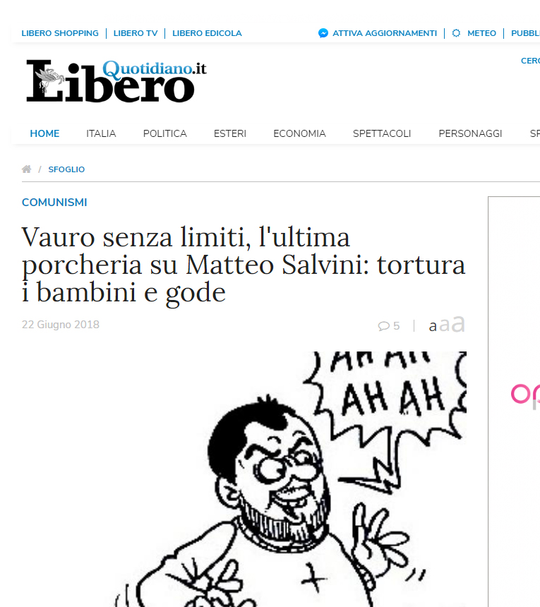 22/06/2018 LIBERO: “Vauro senza limiti, l’ultima porcheria su Matteo Salvini: tortura i bambini e gode”