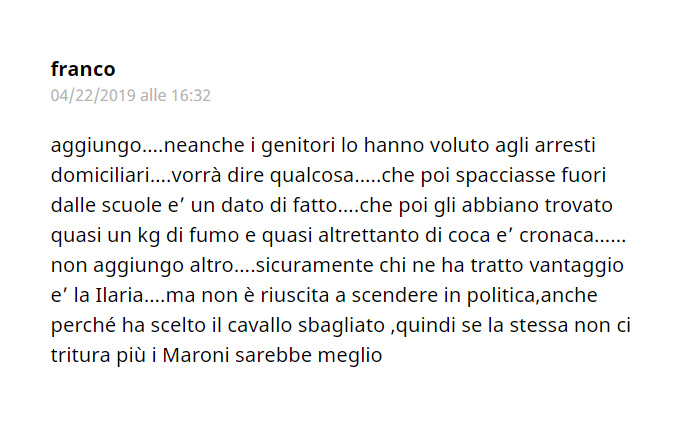aggiungo….neanche i genitori lo hanno voluto agli arresti domiciliari….vorrà dire qualcosa…..che poi spacciasse fuori dalle scuole e’ un dato di fatto….che poi gli abbiano trovato quasi un kg di fumo e quasi altrettanto di coca e’ cronaca……non aggiungo altro….sicuramente chi ne ha tratto vantaggio e’ la Ilaria….ma non è riuscita a scendere in politica,anche perché ha scelto il cavallo sbagliato ,quindi se la stessa non ci tritura più i Maroni sarebbe meglio