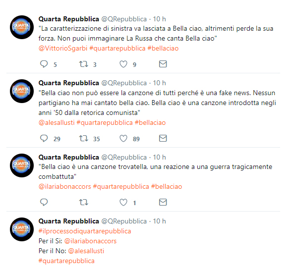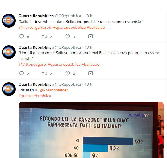 VIDEO e FOTOGALLERY TWITTER – Lunedì 29 aprile sono stato ospite di “Quarta Repubblica” di Nicola Porro su Rete4. La canzone “Bella Ciao” rappresenta tutti gli italiani? Si può cantare a scuola? In Chiesa?