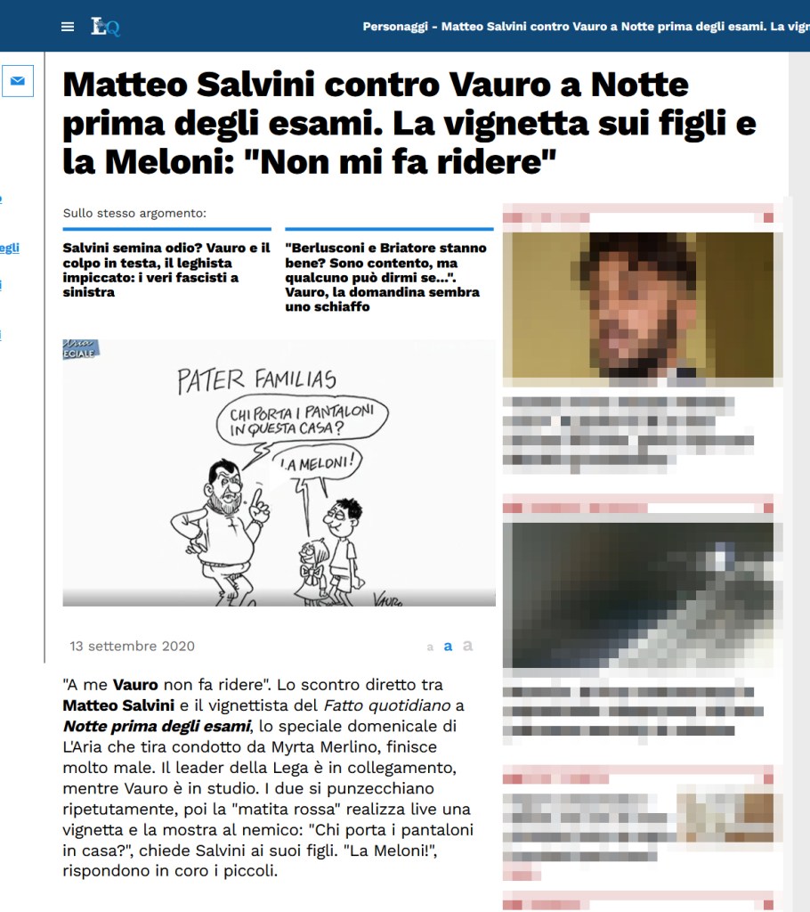 13/09/2020 — Consuete vignette di Vauro a L’Aria che tira su La7, e scatta la polemica con Matteo Salvini in diretta tv. “Ero rimasto colpito da questa figura di Salvini-padre, che si descrive come un padre giusto ma severo. Quindi me lo sono immaginato così in casa”, spiega il disegnatore mostrando il ‘pater familias’ Salvini alle prese con i figli (…). Salvini: “A me Vauro non fa ridere, mi spiace. Sarò io che sono intellettualmente poco sviluppato ma a me non fanno ridere”, il commento secco del leader leghista. “Io sono un giullare, ma non il tuo giullare”, la replica di Vauro. E’ poi la volta del ‘thriller della Lombardia Film Commission’, con Salvini intento a guardare al cinema ‘I tre commercialisti’ che salta sulla sedia alla richiesta di ‘pop corn’. E il leader della Lega, seccato, ribadisce il concetto: “Continua a non farmi ridere”. (ADNKRONOS)