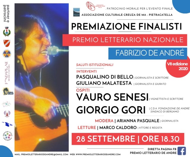 Il 28 settembre si terrà la premiazione online della VII edizione del Premio Letterario Nazionale Fabrizio De André! La diretta sarà visibile a tutti dalla pagina facebook Premio Letterario De André