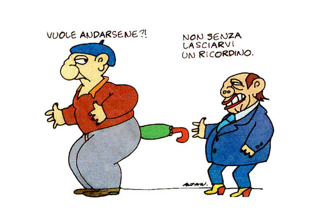 L’immagine cruda e cinica dell’ombrello nelle natiche rappresenta una metafora politica del sopruso. Recentemente, il vignettista Vauro l’ha ripresa sostituendo l’ombrello con un euromissile, un simbolo ancora più minaccioso, rivolto contro un ignaro cittadino.