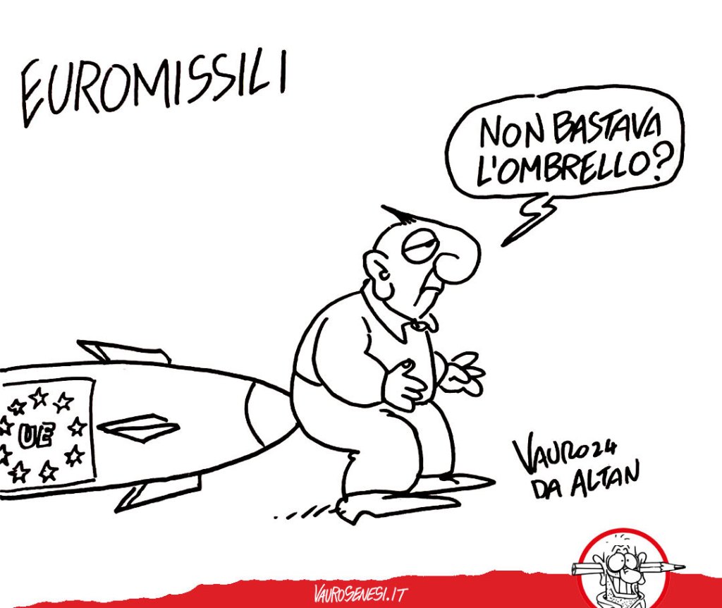 La vignetta di Vauro che richiama la satira di Altan con l’ombrello trasformato in euromissile è un esempio perfetto di come la satira possa evolversi mantenendo la stessa essenza. L’ombrello di Altan rappresentava già una situazione di disagio e sopruso, un futuro amaro per la classe lavoratrice italiana. Vauro, con la sua versione, amplifica il messaggio, suggerendo un pericolo ancora più imminente e devastante, come quello di un euromissile.