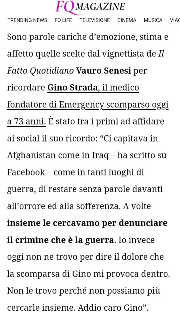 Sono parole cariche d’emozione, stima e affetto quelle scelte dal vignettista de Il Fatto Quotidiano Vauro Senesi per ricordare Gino Strada, il medico fondatore di Emergency scomparso oggi a 73 anni. È stato tra i primi ad affidare ai social il suo ricordo: “Ci capitava in Afghanistan come in Iraq – ha scritto su Facebook – come in tanti luoghi di guerra, di restare senza parole davanti all’orrore ed alla sofferenza. A volte insieme le cercavamo per denunciare il crimine che è la guerra. Io invece oggi non ne trovo per dire il dolore che la scomparsa di Gino mi provoca dentro. Non le trovo perché non possiamo più cercarle insieme. Addio caro Gino”. [Il Fatto, 13/08/2021]