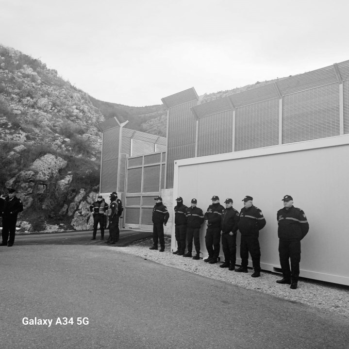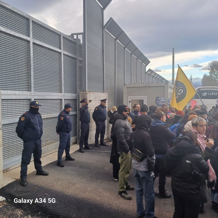 Luoghi militarizzati e marginalizzati questi, non-spazi attentamente selezionati e ri-significati come campi di detenzione e carceri. A Gjadèr, mentre gli attivisti presiedevano e la polizia attendeva in assetto antisommossa dietro i cancelli, ho potuto misurare con lo sguardo la mostruosa architettura incastrata tra le montagne e il paesaggio rurale. Non potrebbe essere stato altrimenti, Gjadèr, contemporanea e tragica Fortezza Bastiani, è collocata secondo il principio di continuità dei confini che devono apparire inviolabili e senza tempo, parti integranti della natura (Khosravi 2023). Primordiali e con statuto indiscutibile. Il centro, posto a pochi chilometri dal piccolo paese, soffoca un’abitazione dove la proprietaria parlando con un’attivista dice che “non è stata chiesta alcuna autorizzazione a lei e alla sua famiglia” e “non è stato pagato nessun indennizzo dall’esercito italiano”, aggiungendo che “comunque loro non vogliono mettersi contro il governo”.