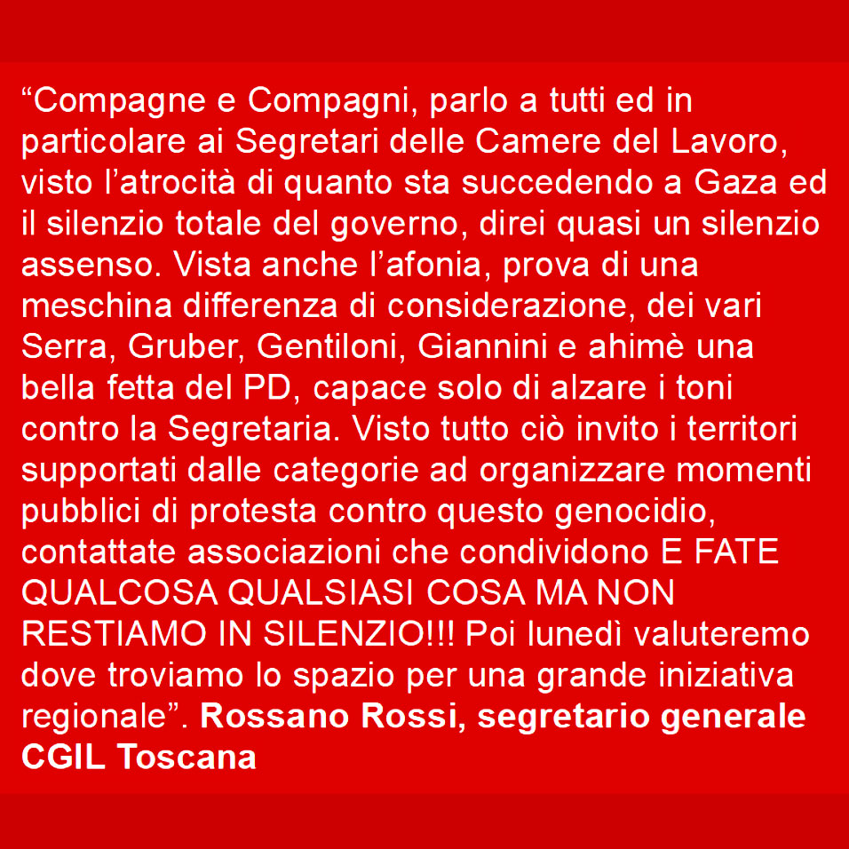 “Compagne e Compagni, parlo a tutti ed in particolare ai Segretari delle Camere del Lavoro, visto l’atrocità di quanto sta succedendo a Gaza ed il silenzio totale del governo, direi quasi un silenzio assenso. Vista anche l’afonia, prova di una meschina differenza di considerazione, dei vari Serra, Gruber, Gentiloni, Giannini e ahimè una bella fetta del PD, capace solo di alzare i toni contro la Segretaria. Visto tutto ciò invito i territori supportati dalle categorie ad organizzare momenti pubblici di protesta contro questo genocidio, contattate associazioni che condividono E FATE QUALCOSA QUALSIASI COSA MA NON RESTIAMO IN SILENZIO!!! Poi lunedì valuteremo dove troviamo lo spazio per una grande iniziativa regionale”. Rossano Rossi, segretario generale CGIL Toscana