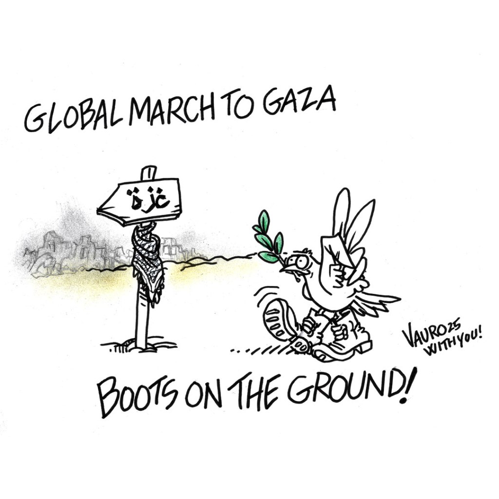 13 giugno 2025 | “Boots on the ground” per la pace, non per la violenza. Non siamo soldati, né eserciti: i nostri stivali calpestano la terra per difendere la vita, non per esercitare violenza. ✊ La solidarietà non conosce frontiere. Vauro Senesi a sostegno di Global March to Gaza🙏🏻🇵🇸☮️