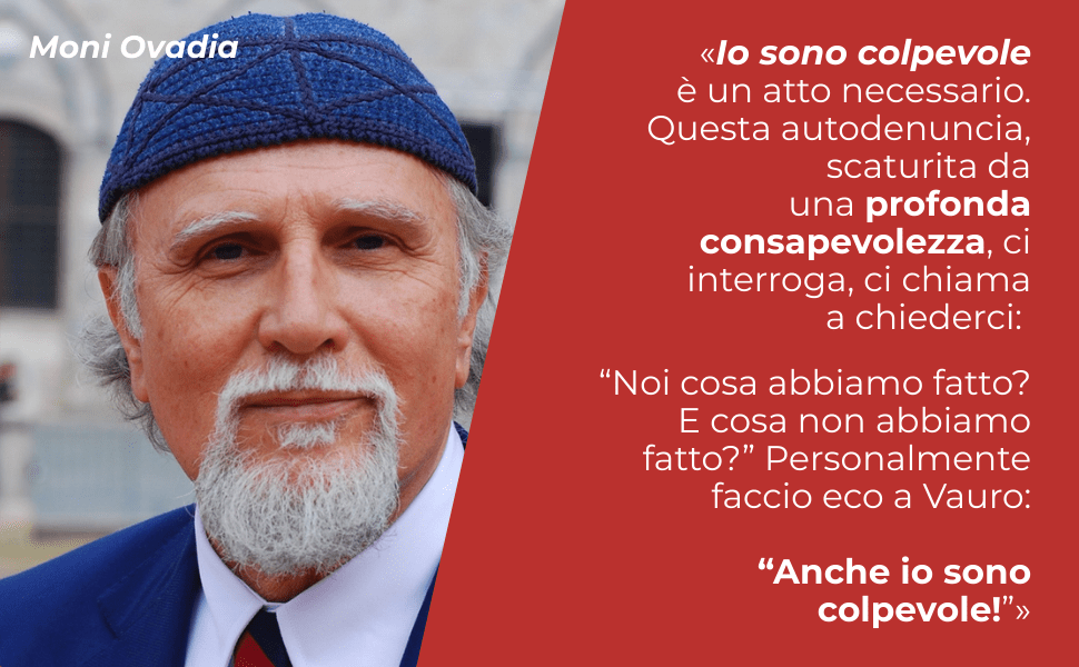 «Io sono colpevole è un atto necessario. Il titolo stesso è una denuncia che Vauro pronuncia contro sé stesso per non avere fatto e non avere saputo fare abbastanza perché il genocidio fosse impedito. Questa autodenuncia, scaturita da una profonda consapevolezza, ci interroga, ci chiama a chiederci: “Noi cosa abbiamo fatto? E cosa non abbiamo fatto?” Personalmente faccio eco a Vauro: “Anche io sono colpevole!”». (dalla Postfazione di Moni Ovadia)