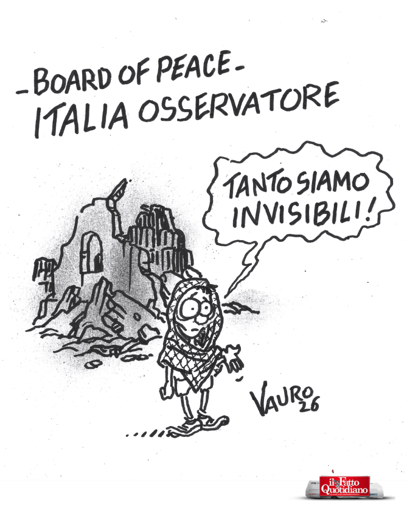Articoli, Il Fatto Quotidiano, L'ultima vignetta di Vauro, Le vignette di VauroGaza, Tajani: “L’Italia sarà nel Board of Peace da Paese osservatore” (Il Fatto, 17 feb 2026) Leggi anche: “Trump, Board of Peace per Gaza (20 gen 2026)” Digita la tua e-mail… Iscriviti L’ULTIMA vignetta di Vauro condividi/share Invia un link a un amico via e-mail (Si apre in una nuova finestra) E-mail Condividi su Facebook (Si apre in una nuova finestra) Facebook Condividi su WhatsApp (Si apre in una nuova finestra) WhatsApp Condividi su Telegram (Si apre in una nuova finestra) Telegram Condividi su Mastodon (Si apre in una nuova finestra) Mastodon Condividi su Bluesky (Si apre in una nuova finestra) Bluesky Correlati