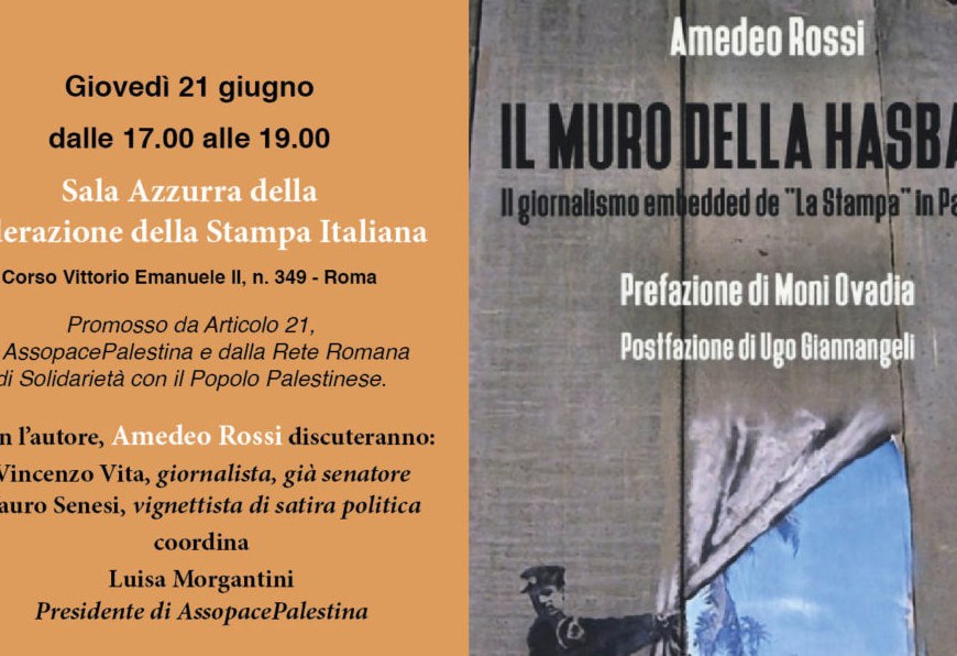 Giovedì 21 giugno 2018 dalle ore 17,00 – ROMA, Sala Azzurra della Federazione Italiana della Stampa. Presentazione del libro “IL MURO DELLA HASBARÀ” di Amedeo Rossi, con l’autore, Vincenzo Vita e Vauro Senesi. Il dibattito sarà moderato da Luisa Morgantini Continua a leggere La Palestina e il ruolo dell’informazione – Roma, giovedì 21 giugno, Fnsi – Articolo21