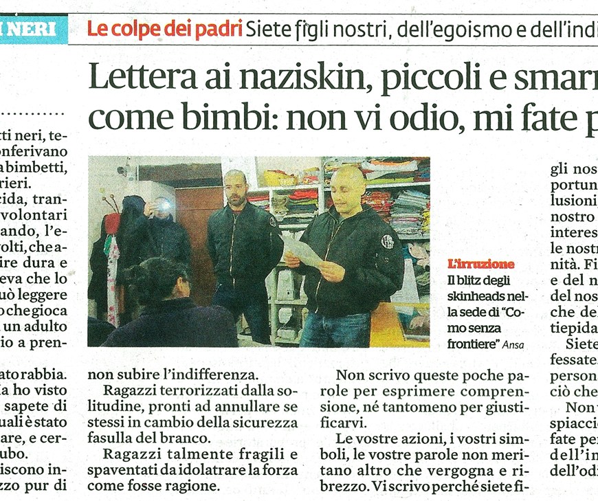 Dopo il blitz anti migranti a Como Lettera ai naziskin – Vauro, Il Fatto Quotidiano (01.12.2017) Vi ho visti. Giubbotti neri, teste rasate che vi conferivano un aspetto imberbe da bimbetti, più che da truci guerrieri. Di fronte alla placida, tranquilla reazione dei volontari che stavate circondando, l’espressione sui vostri volti, che avrebbe voluto apparire dura e maschia, non esprimeva che lo smarrimento che si … Continua a leggere Lettera ai Naziskin